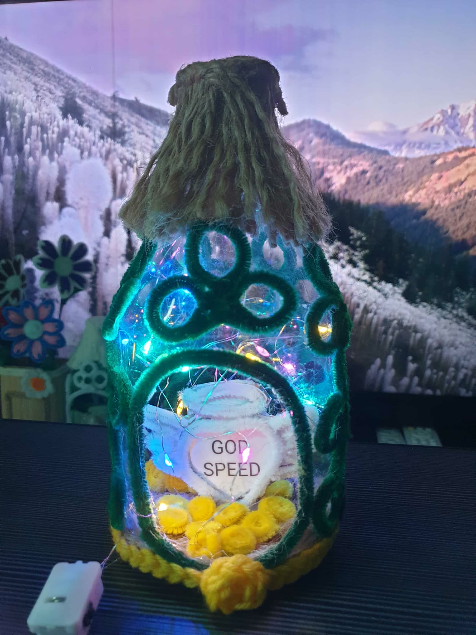 Organic fuzzy wire designs around the lamp, with an abaca thread roof, fairy battery powered lights inside, and a heart shaped angel mini picture frame. You may add a photo of yourself, a loved one, anything that comes to mind!